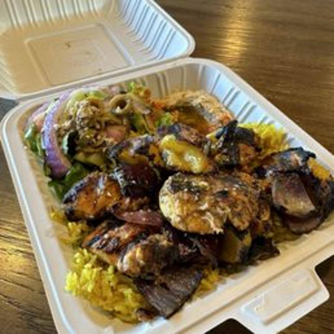 Grilled skewers of marinated meat (chicken, beef, or lamb) and vegetables. Served with your choice of side.