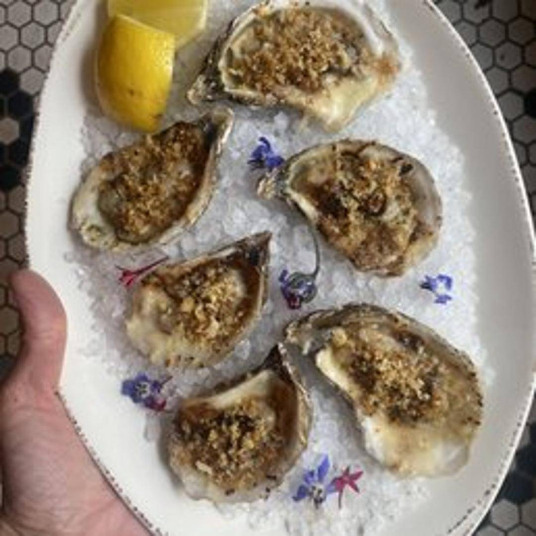 Freshly shucked oysters, presented on a bed of ice, celebrated for their briny essence and delicate texture. Served with classic accompaniments to enhance their natural ocean flavor.