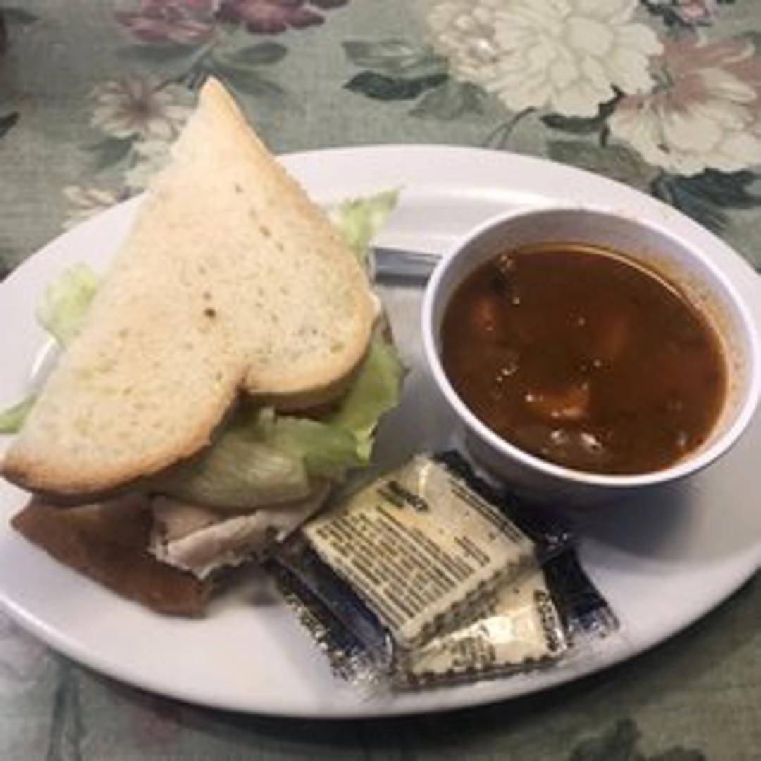 A generous portion of sliced roasted turkey served open-faced on your choice of toasted bread, smothered in savory gravy. Accompanied by a side of mashed potatoes and a seasonal vegetable.