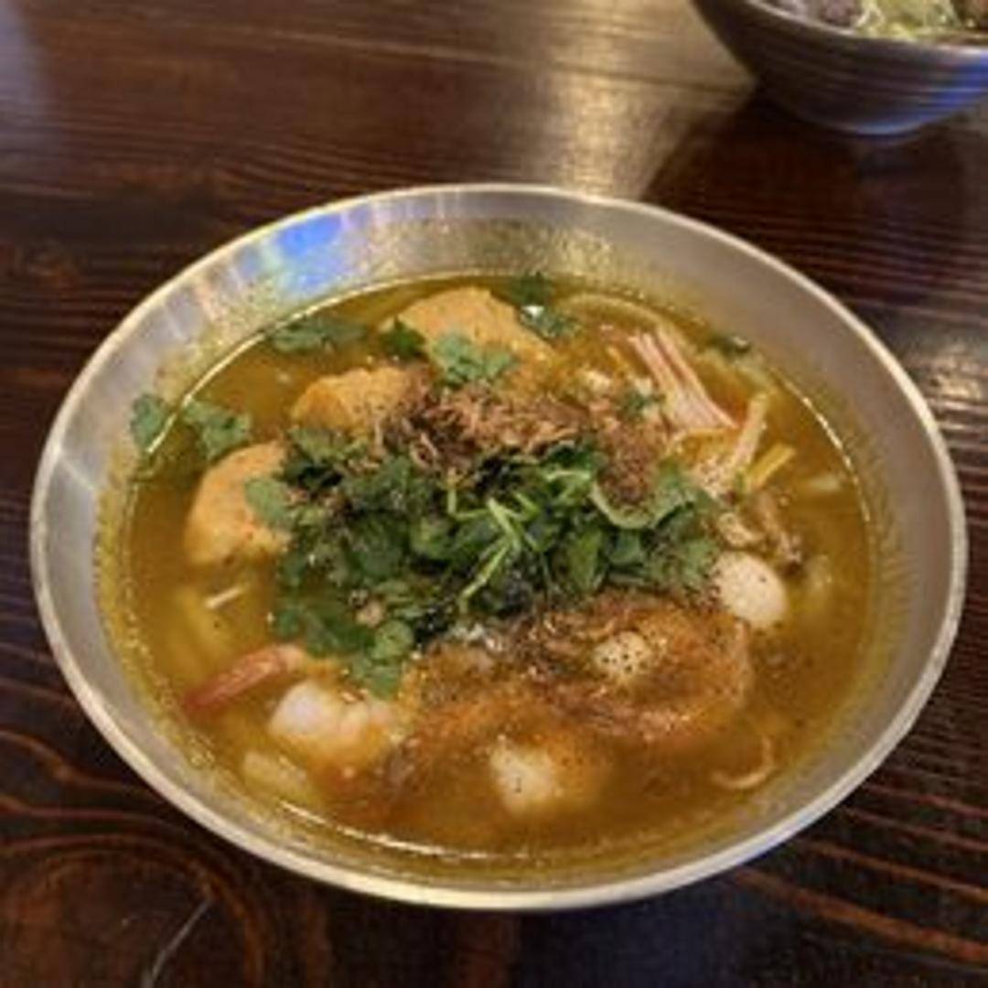 A thick Vietnamese noodle soup with crab meat, shrimp, and tapioca noodles in a rich and flavorful broth. Garnished with green onions and cilantro.