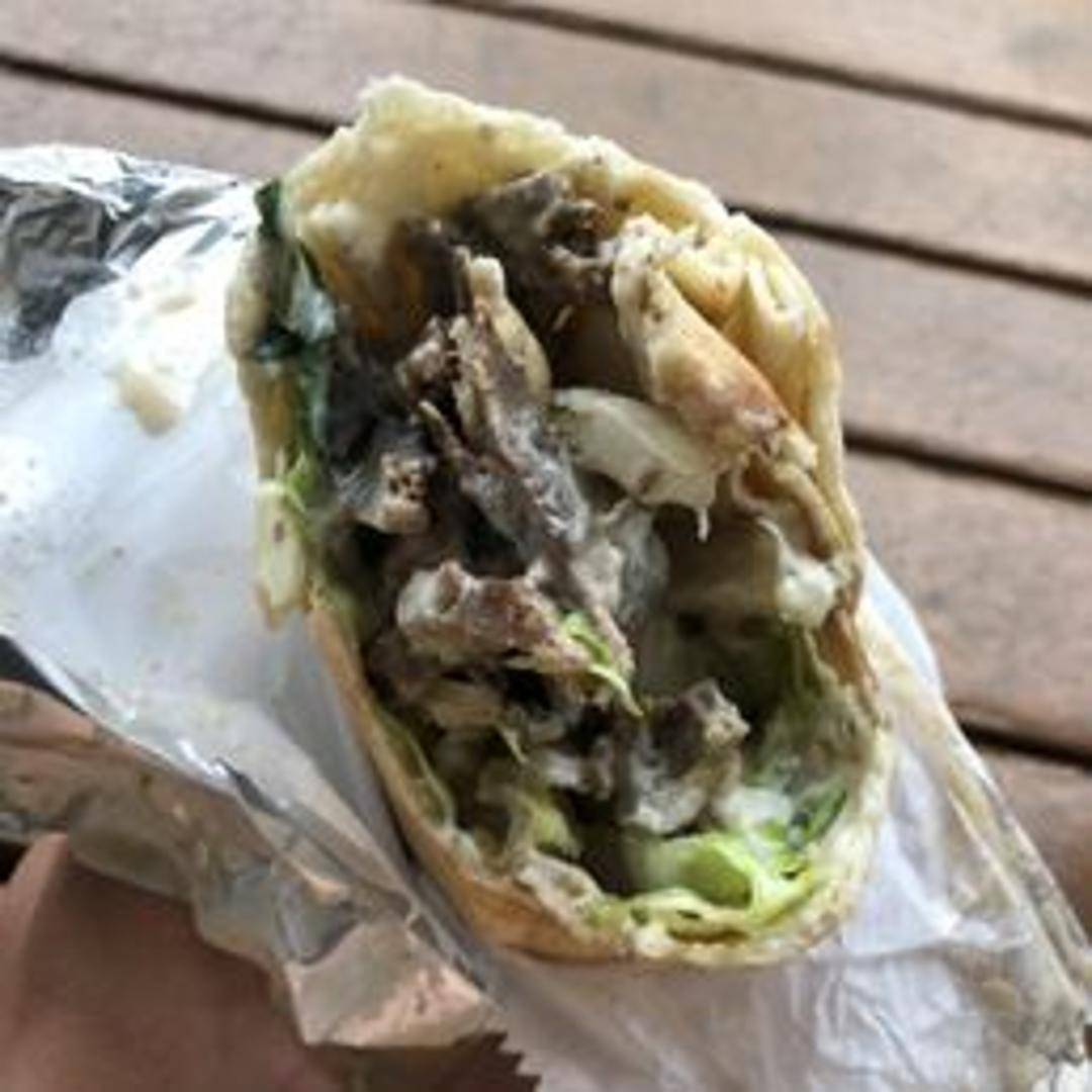 Thinly sliced, seasoned lamb shawarma meat, slow-cooked on a vertical spit, wrapped in warm pita bread with fresh toppings like lettuce, tomatoes, onions, and tahini sauce.