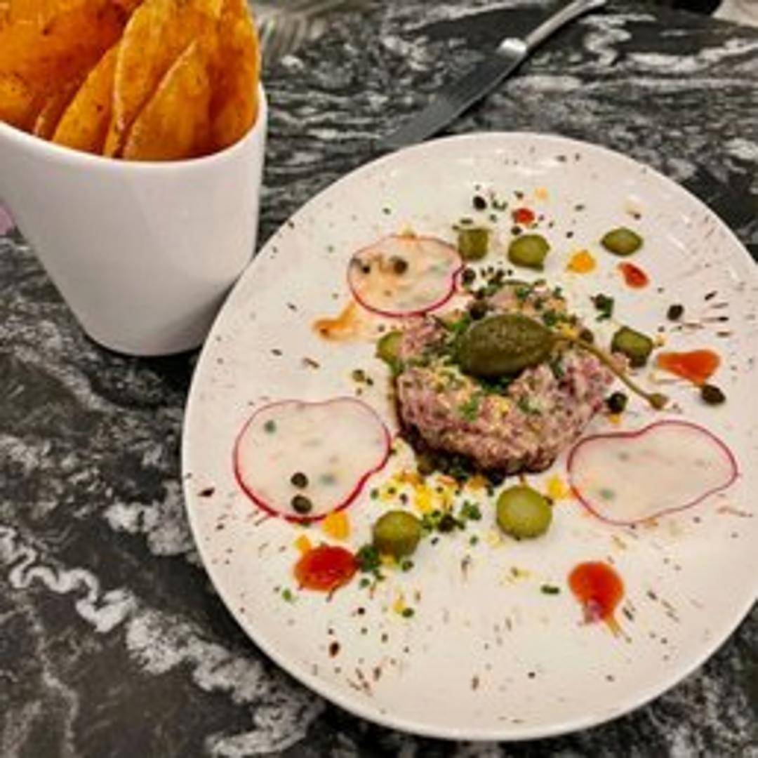 Finely chopped raw beef, seasoned and often served with capers, onions, egg yolk, and toast points.