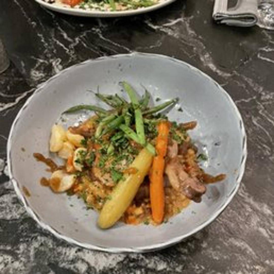 Duck leg, often confited (preserved in its own fat and slow-cooked), resulting in a tender and flavorful dish with crispy skin.