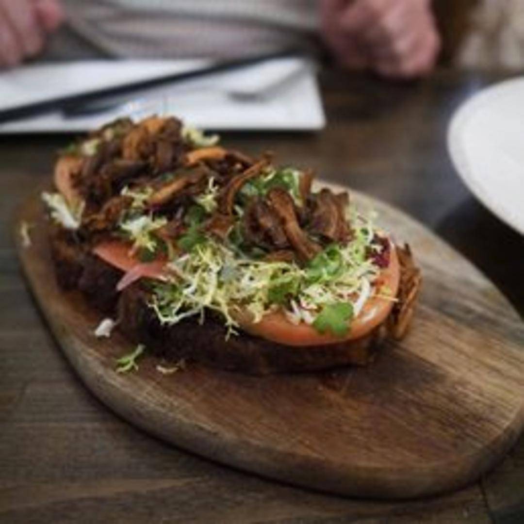 A sophisticated, plant-based reimagining of the classic BLT. This open-faced delight features vibrant, juicy slices of heirloom tomatoes, crisp plant-based 'bacon', and fresh, tender lettuce, all nestled atop perfectly toasted artisanal bread, finished with a creamy vegan aioli for a harmonious blend of textures and flavors.