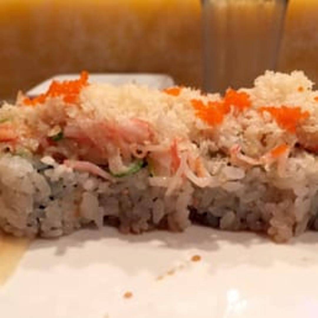 California roll topped with baked seafood (typically a mix of crab, shrimp, and scallops) in a creamy, spicy sauce. Often garnished with masago, scallions, and a drizzle of eel sauce.