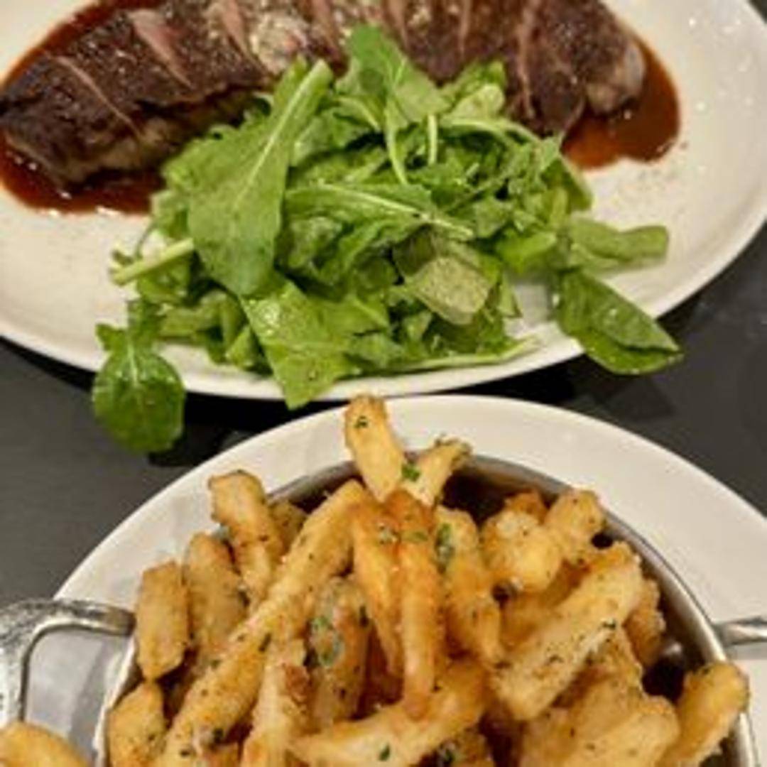 A perfectly grilled steak, served with crispy, golden-brown French fries and a rich sauce, such as béarnaise or au poivre.
