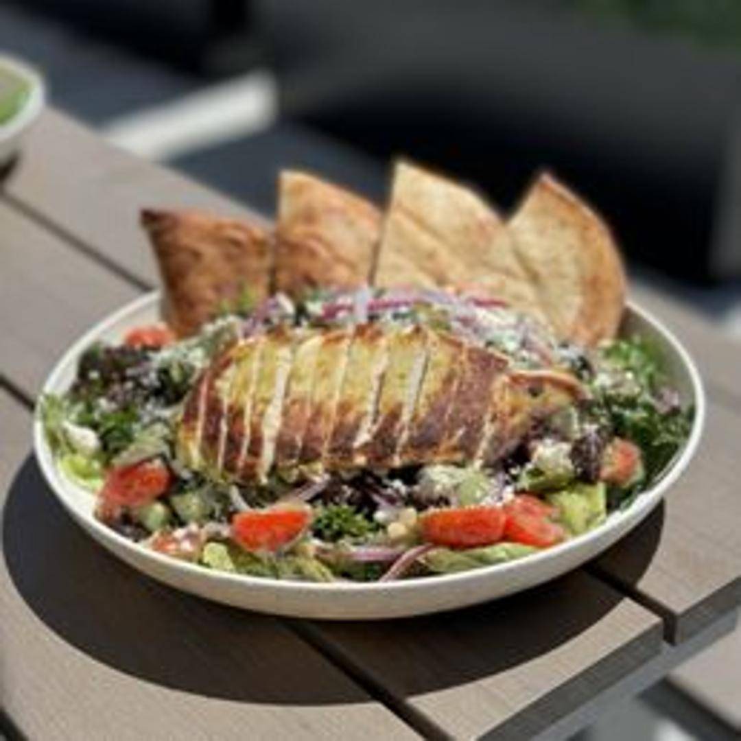 A seasonal harvest salad with roasted root vegetables (such as sweet potatoes and beets), quinoa, spinach, dried cranberries, pumpkin seeds, and an apple cider vinaigrette.