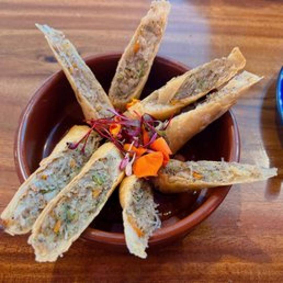 Crispy, deep-fried spring rolls filled with a savory mixture of vegetables and glass noodles, served with a sweet and sour dipping sauce.