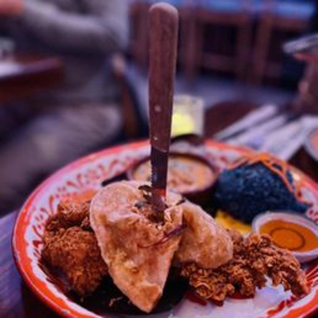 Southern Thai-style fried chicken marinated in a blend of aromatic spices, then fried to a golden-brown crisp. Served with a side of sticky rice and crispy fried shallots. Often accompanied by a sweet chili dipping sauce.