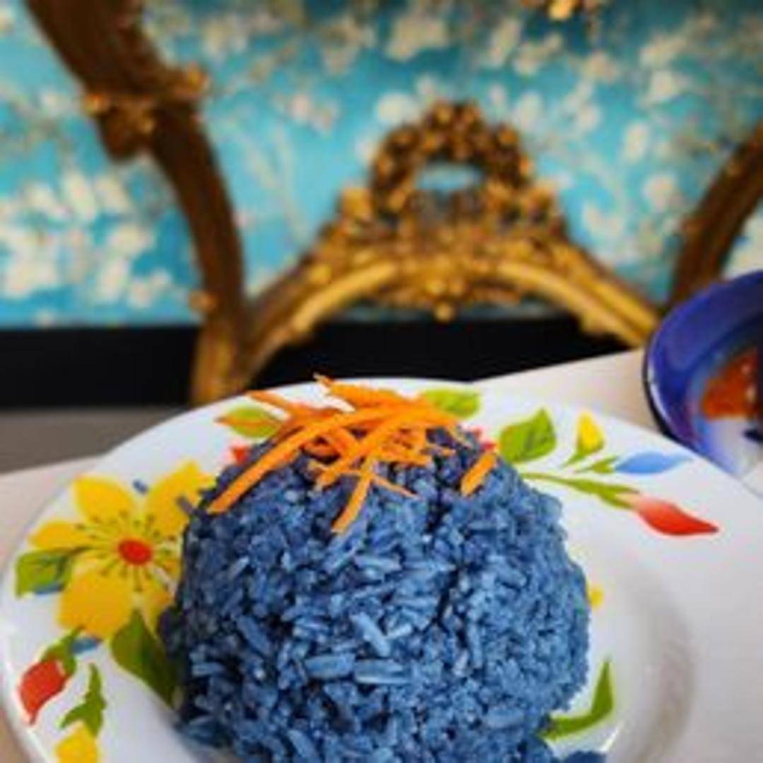 Fragrant jasmine rice infused with natural blue coloring, offering a visually appealing and aromatic accompaniment to any dish.
