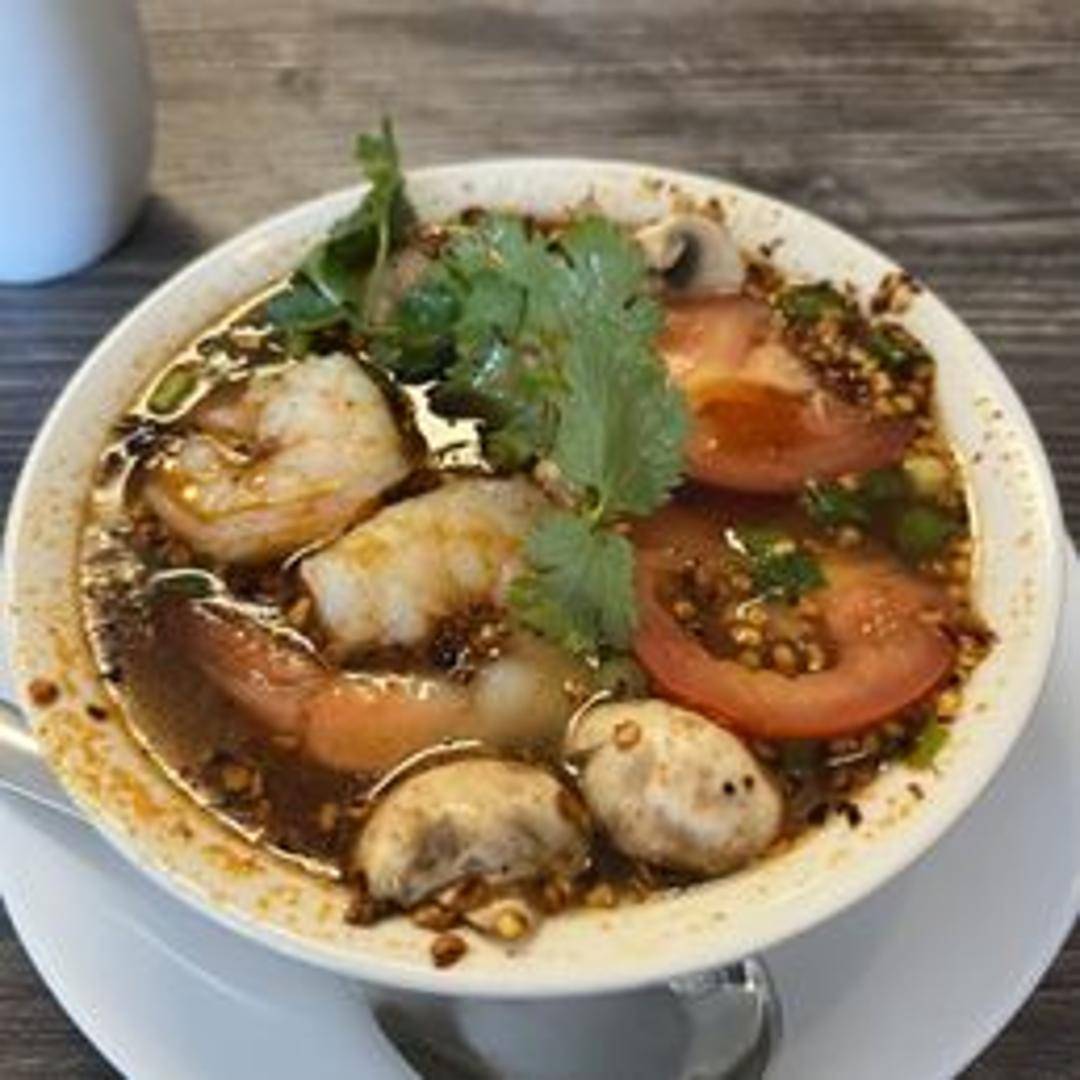 A hot and sour soup flavored with lemongrass, galangal, kaffir lime leaves, chili peppers, mushrooms, tomatoes, and your choice of protein. Offers a bold and refreshing flavor.