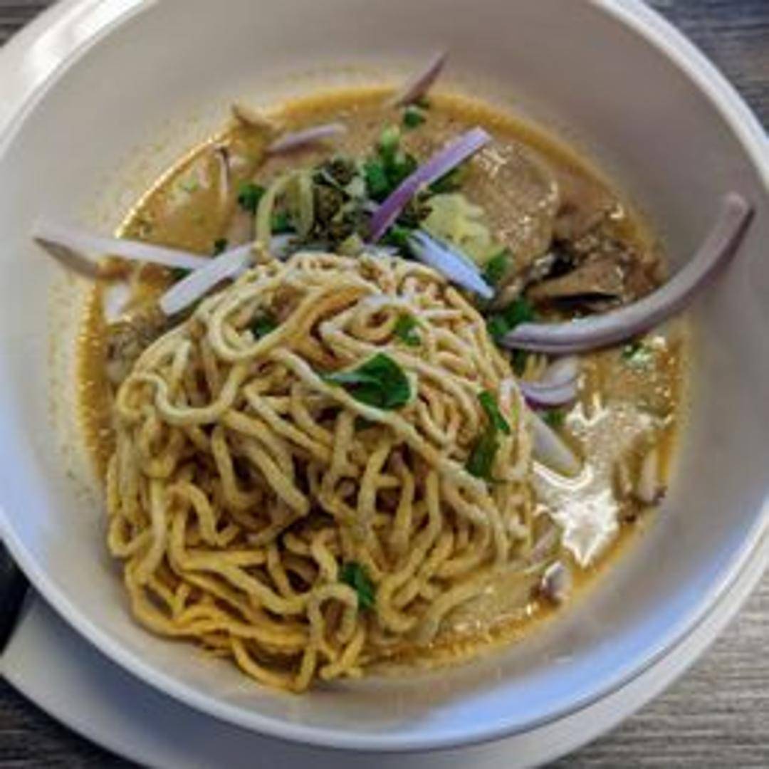 A Northern Thai coconut curry noodle soup, featuring egg noodles in a rich and creamy broth, topped with crispy noodles, pickled mustard greens, shallots, lime, and chili oil. Often served with your choice of protein.