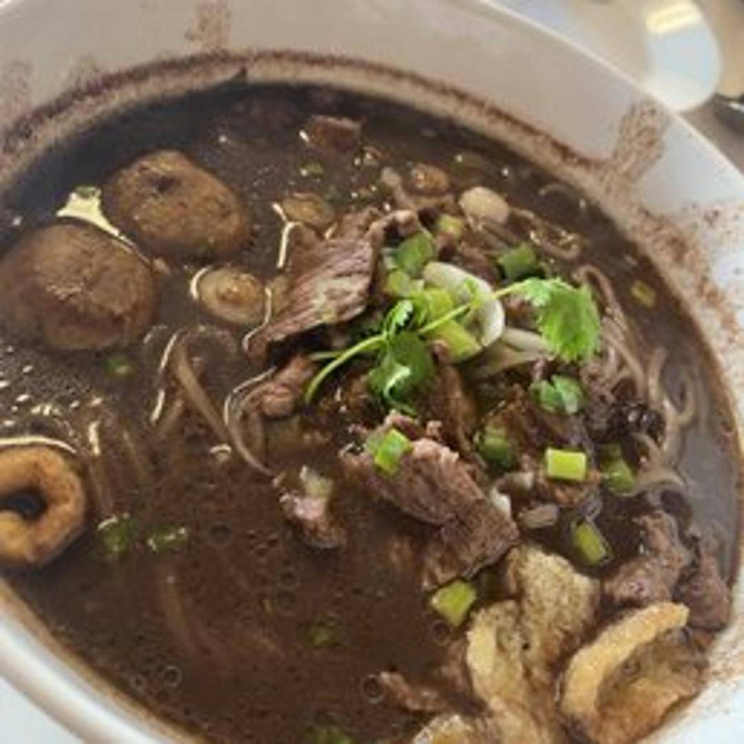 A rich and flavorful broth-based noodle soup, traditionally made with blood, spices, and herbs. Served with rice noodles, meat (often beef or pork), bean sprouts, and Thai basil. Garnished with crispy garlic and cilantro.