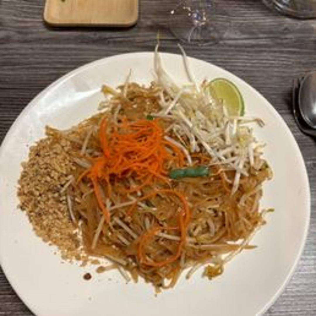 Thailand's iconic stir-fried noodle dish. Rice noodles are wok-tossed with egg, bean sprouts, scallions, and your choice of protein (chicken, shrimp, tofu, or vegetarian). It's seasoned with a tangy tamarind sauce, fish sauce, palm sugar, and often topped with crushed peanuts and a lime wedge for added flavor and freshness.