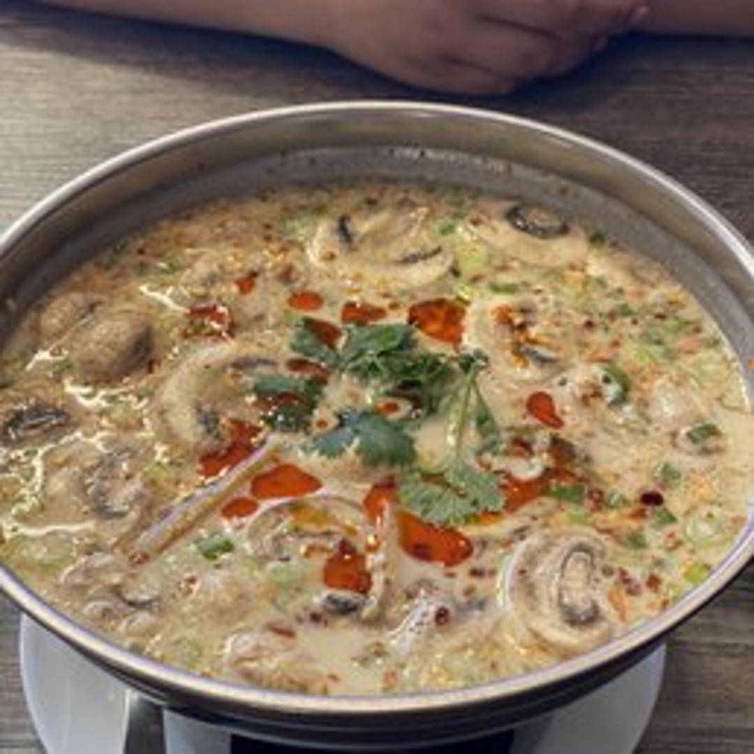 A creamy and aromatic coconut milk soup flavored with galangal, lemongrass, kaffir lime leaves, mushrooms, tomatoes, and your choice of protein. Offers a balance of sweet, sour, and savory flavors.