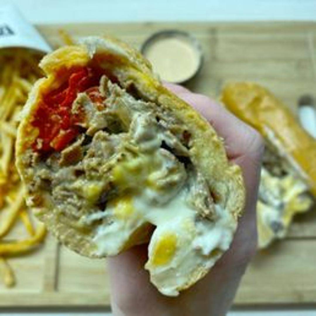 Thinly sliced steak grilled with onions and peppers, covered with melted cheese (usually provolone or whiz) on a hoagie roll.