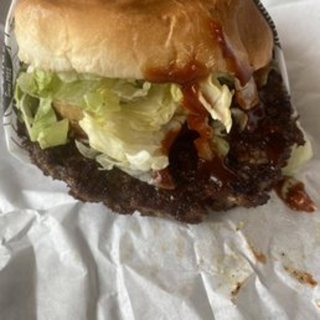A juicy Fatburger topped with crisp bacon, melted cheddar cheese, tangy BBQ sauce, and crispy onion rings. Served on a toasted bun.