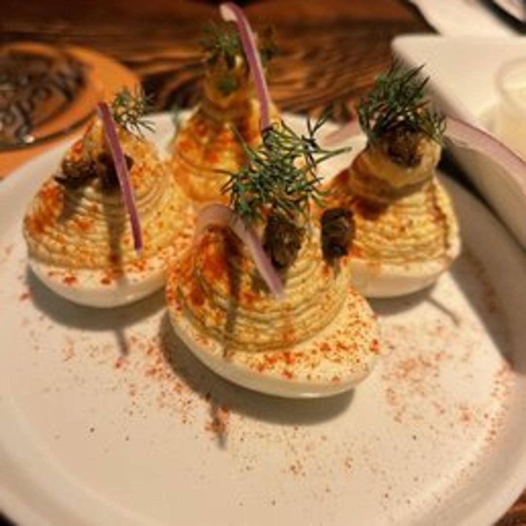 Classic deviled eggs, likely prepared with a creamy yolk mixture seasoned with mustard, paprika, and potentially other spices or herbs. Garnished for visual appeal and enhanced flavor.