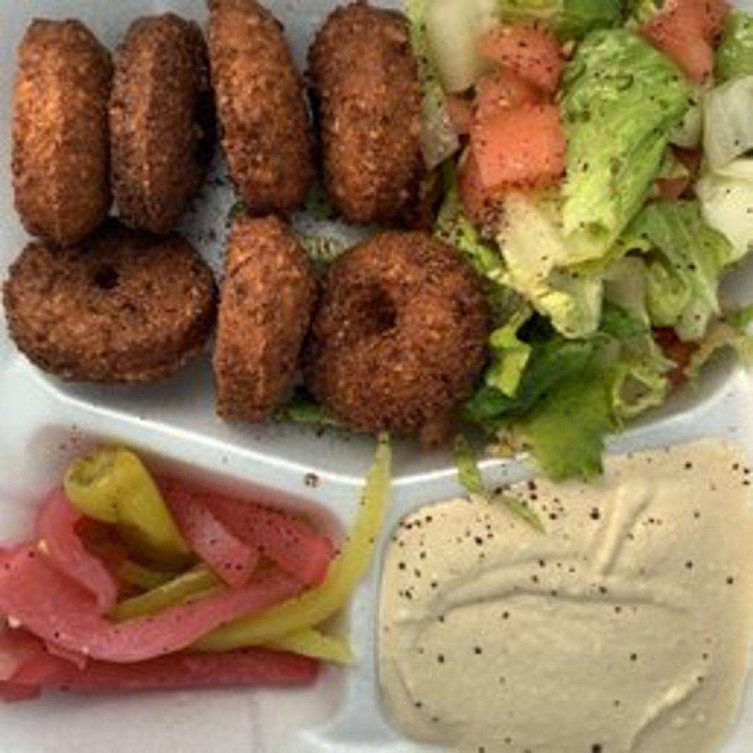 Crispy, golden-brown falafel made from ground chickpeas, herbs, and spices. Served with tahini sauce, fresh vegetables, and pita bread. Your choice of two sides included.