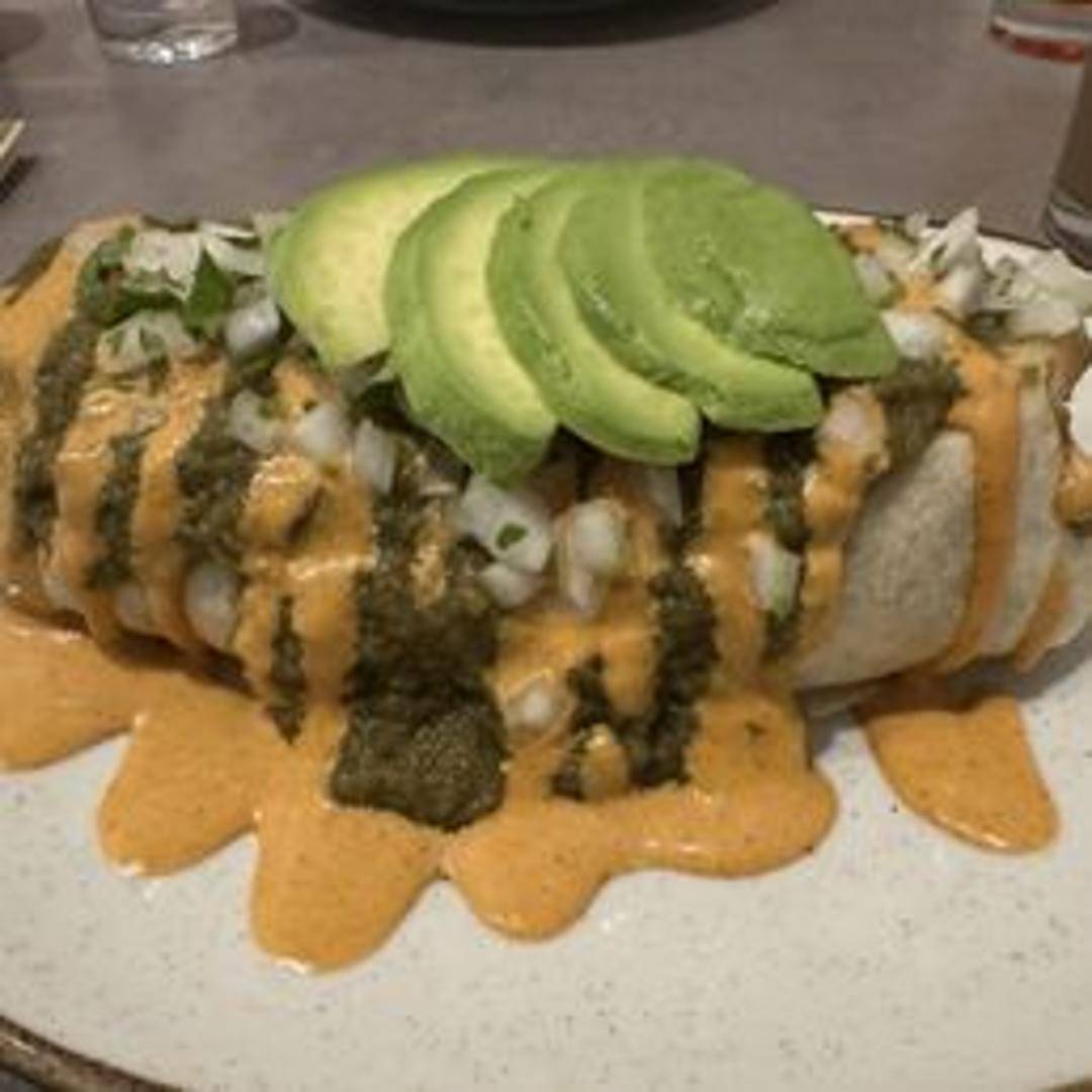 A generous burrito packed with slow-cooked barbecue jackfruit, creamy mac and cheese, collard greens, and a drizzle of tangy BBQ sauce.