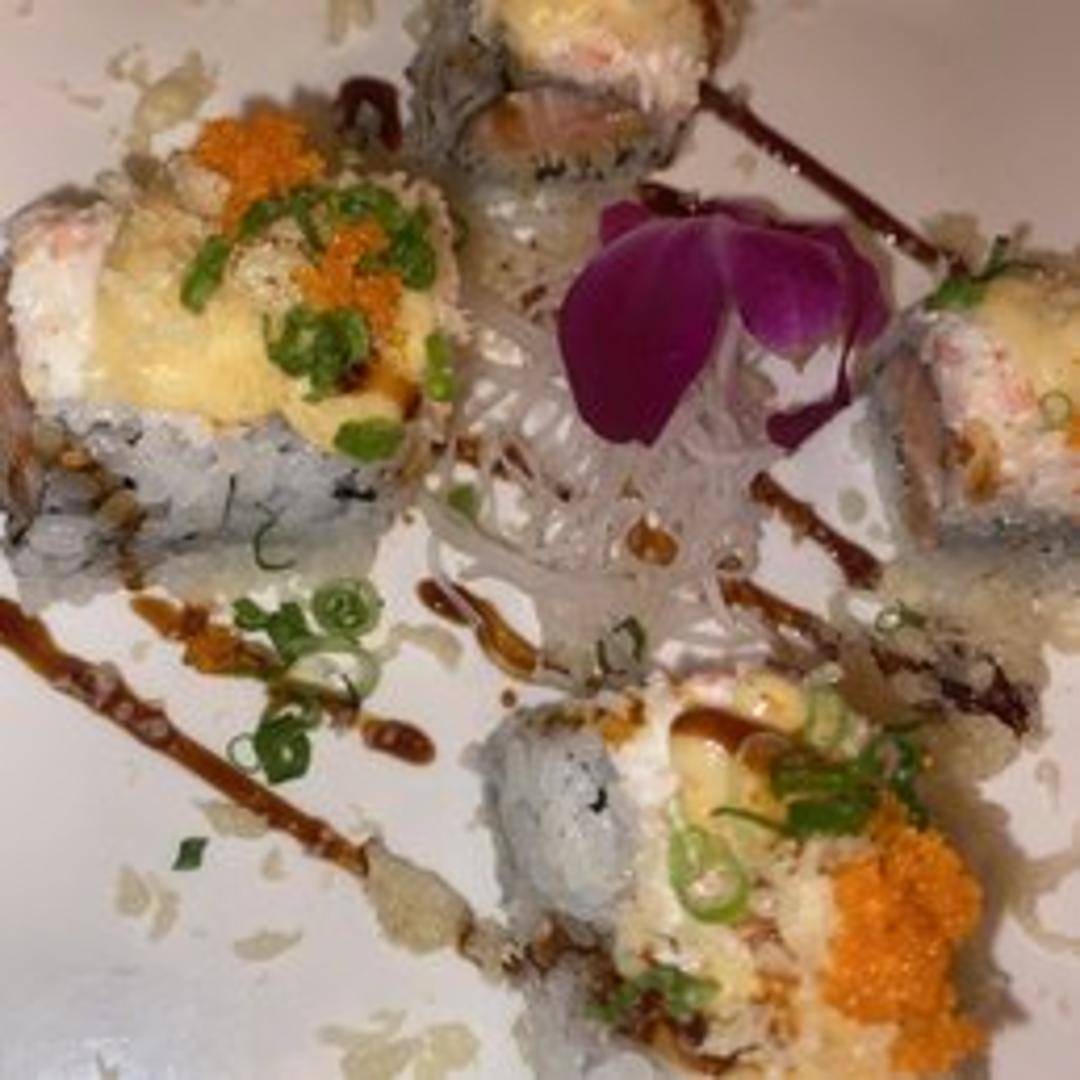 Salmon, avocado, and cucumber roll, topped with spicy mayo and a drizzle of eel sauce.