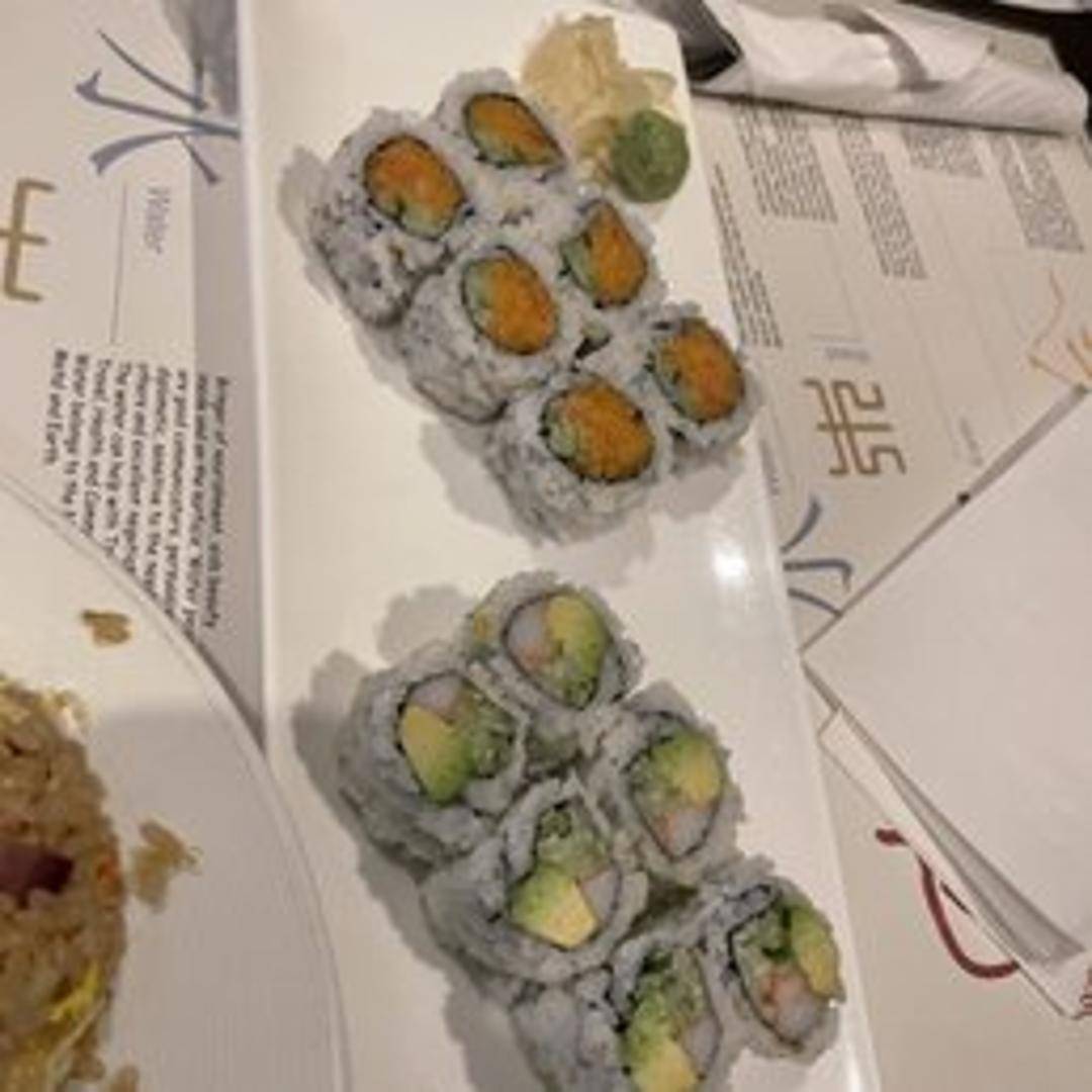 A classic sushi roll filled with imitation crab meat, avocado, and cucumber, wrapped in nori seaweed and sushi rice.