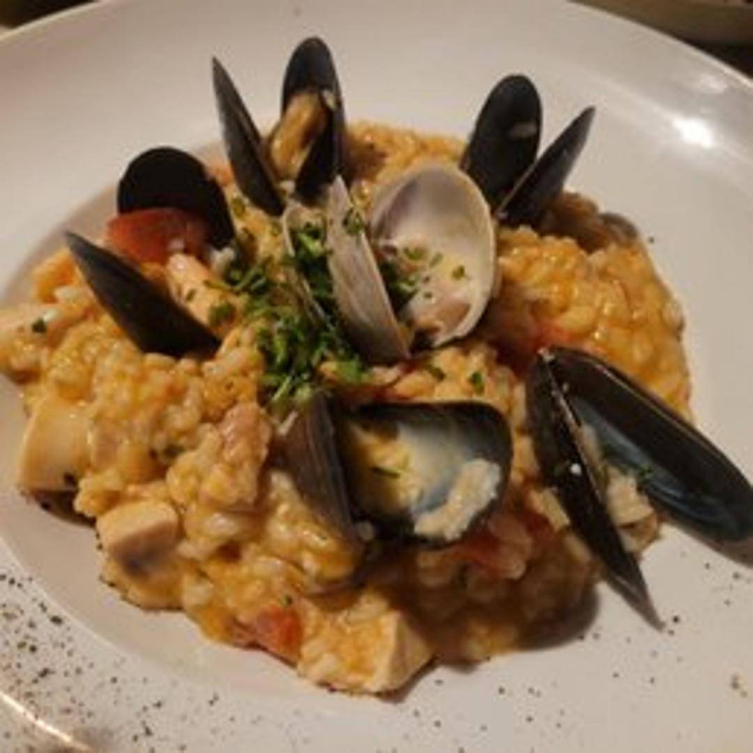 Creamy Arborio rice cooked in a flavorful seafood broth with a medley of fresh seafood including shrimp, mussels, clams, and calamari. Garnished with parsley and a lemon wedge.
