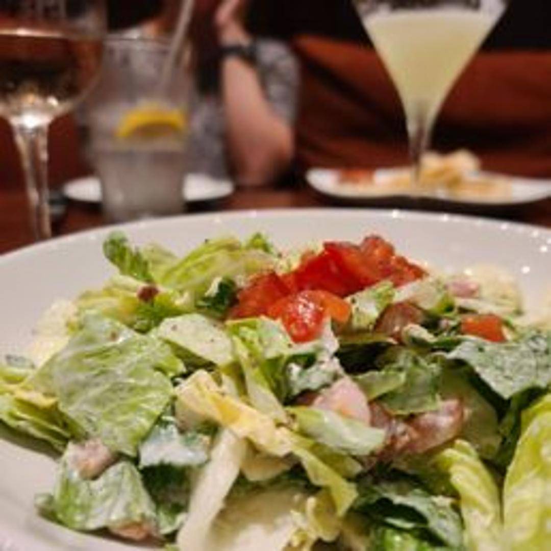 Crisp chopped romaine lettuce tossed with smoked bacon, diced tomatoes, crumbled blue cheese, and a creamy ranch dressing. Garnished with croutons.