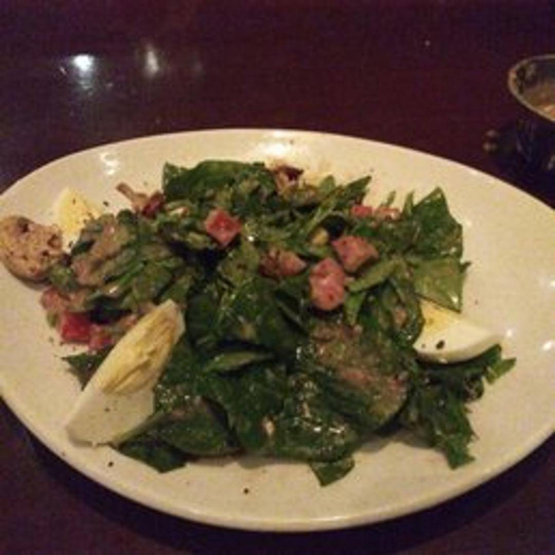 Fresh spinach tossed with bacon, eggs, red onions, mushrooms, tomatoes, and a warm bacon vinaigrette.