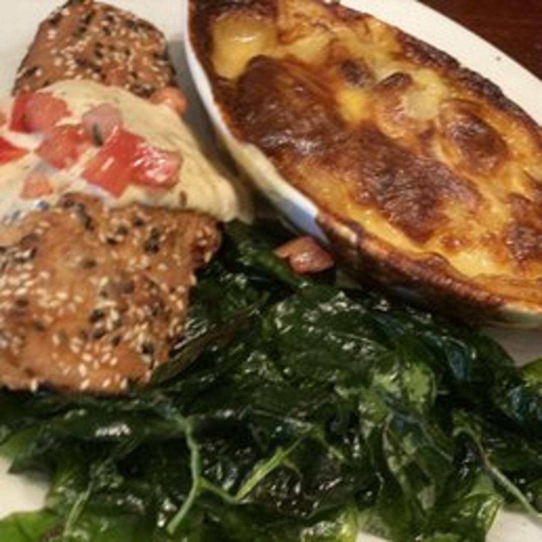 Delight in a succulent Atlantic salmon fillet, generously encrusted with a flavorful blend of toasted sesame seeds. Pan-seared or grilled to achieve a crispy exterior and flaky, moist interior, this dish is often finished with a sweet and savory glaze, delivering a delightful crunch and a rich, nutty flavor profile that complements the fish beautifully.