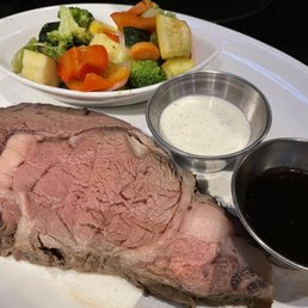 Savor Firebirds' signature Prime Rib, aged for exceptional tenderness and slow-roasted in-house daily over a wood fire to achieve a perfect medium-rare doneness. This succulent cut is renowned for its rich flavor and melt-in-your-mouth texture, served with its natural au jus and a side of creamy horseradish sauce for a truly memorable dining experience.