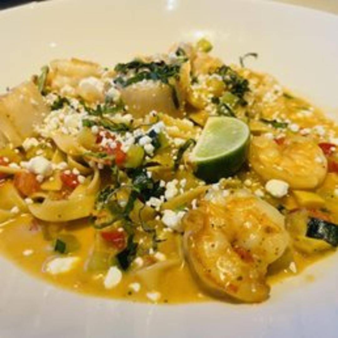 Linguine pasta tossed with shrimp, scallops, mussels, and asparagus in a creamy white wine sauce.