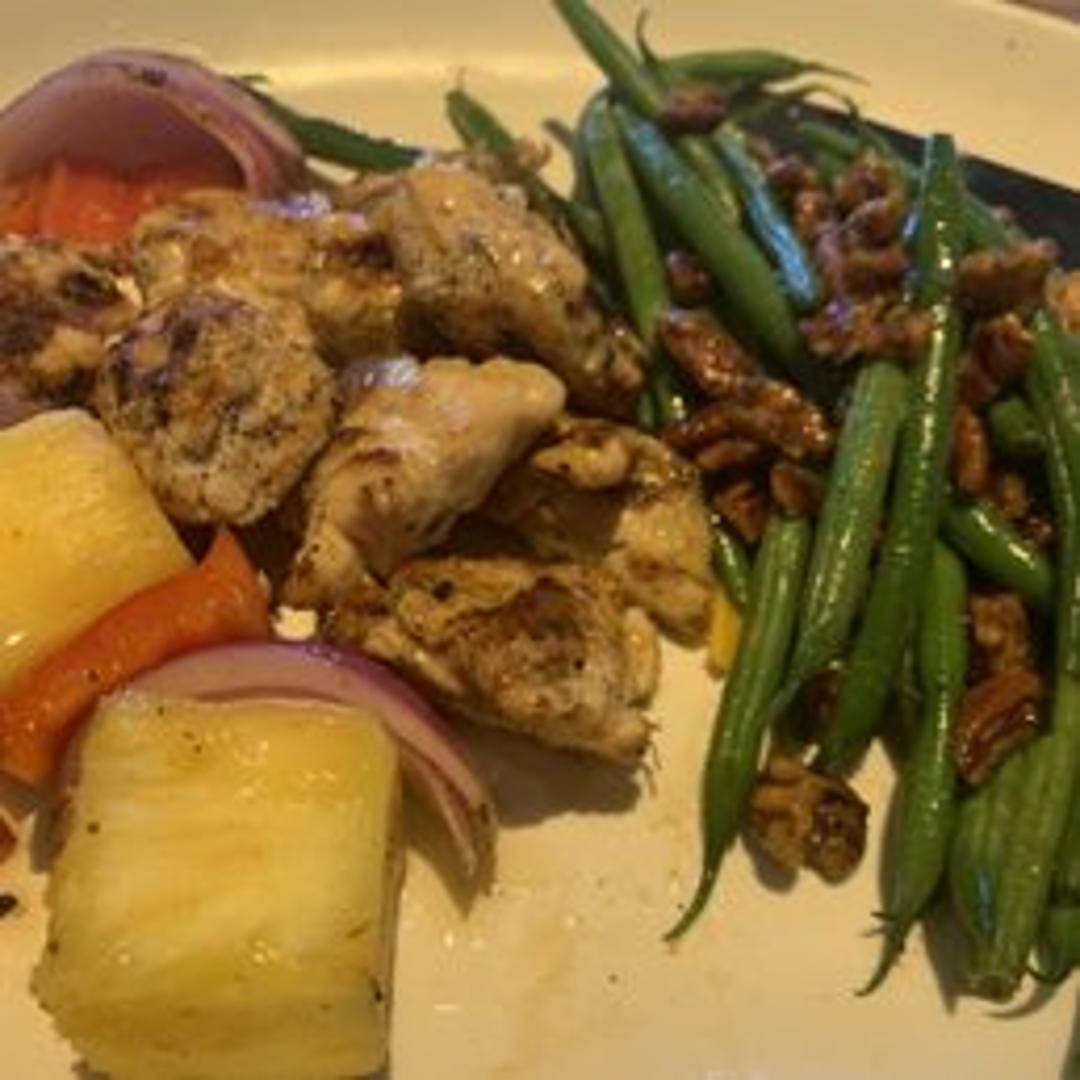 Grilled chicken breast brushed with a sweet and savory pineapple glaze, served with a side of parmesan-dusted mashed potatoes and fresh green beans.