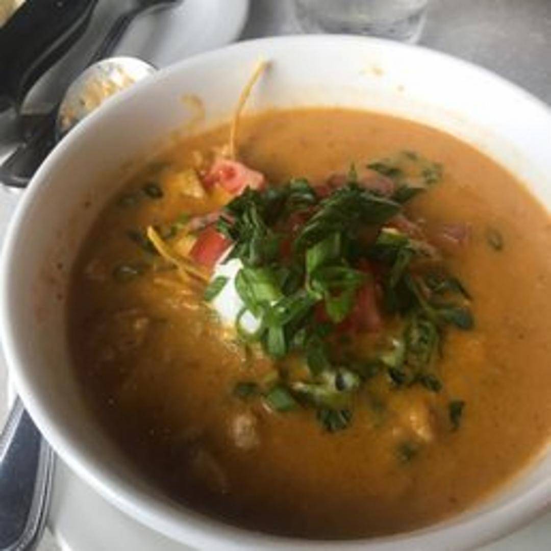 A creamy and flavorful soup featuring shredded chicken, vegetables, and a blend of spices, topped with crispy tortilla strips and a dollop of sour cream.