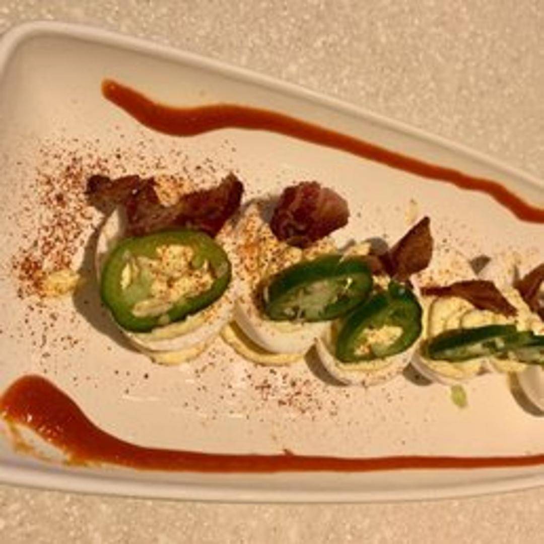 Creamy deviled eggs infused with a touch of jalapeno for a subtle kick. Garnished for a visually appealing presentation and a balanced flavor profile.