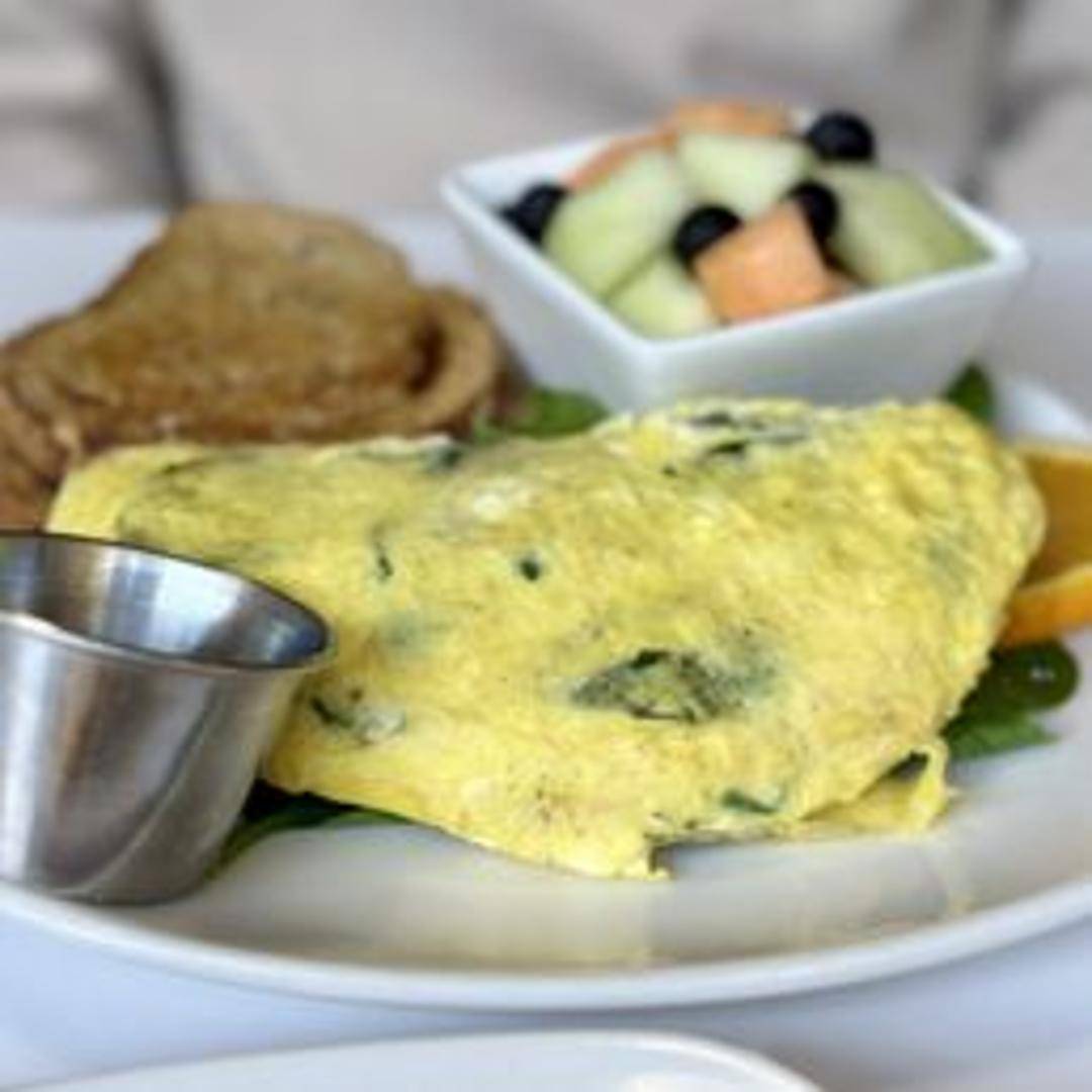 A fluffy three-egg omelette filled with fresh spinach and salty feta cheese. Served with your choice of toast and a side of potatoes or fruit.