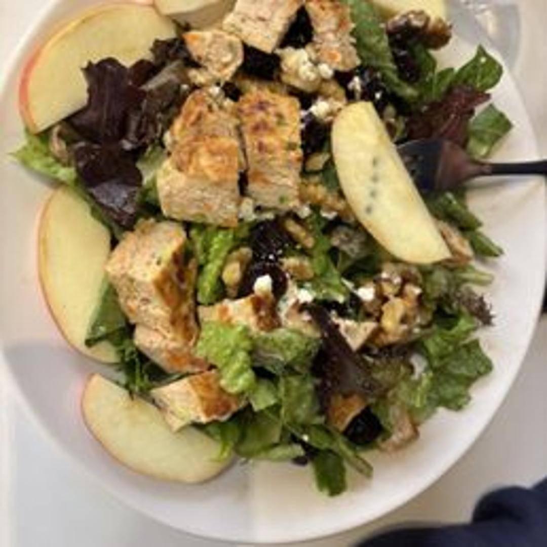 A vibrant salad featuring mixed greens, dried cherries, crumbled blue cheese, walnuts, and grilled chicken or vegetarian option, tossed in a light vinaigrette dressing. Seasonal variations may occur.