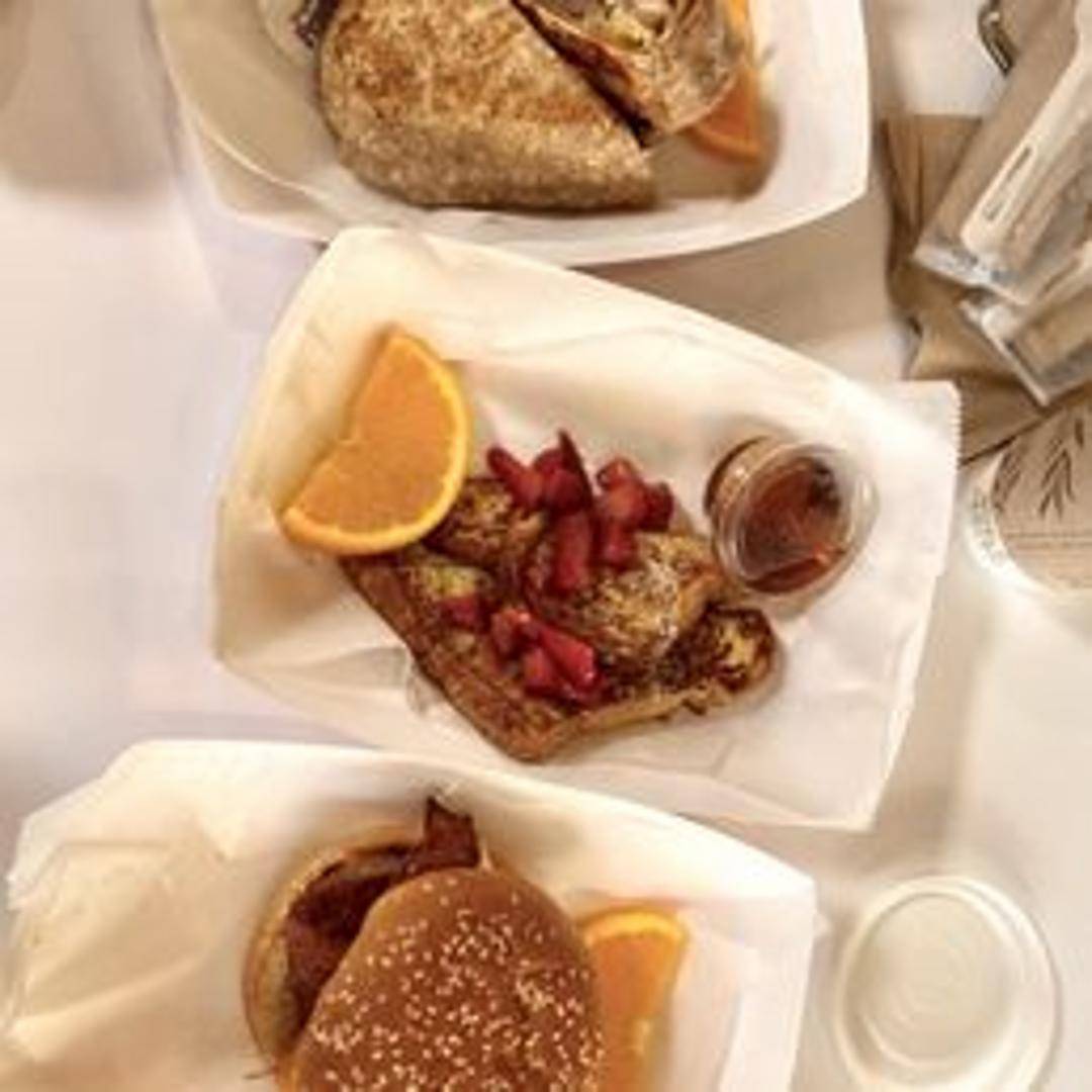A hearty breakfast sandwich with your choice of bread, filled with eggs, cheese, and your choice of bacon, sausage, or ham.