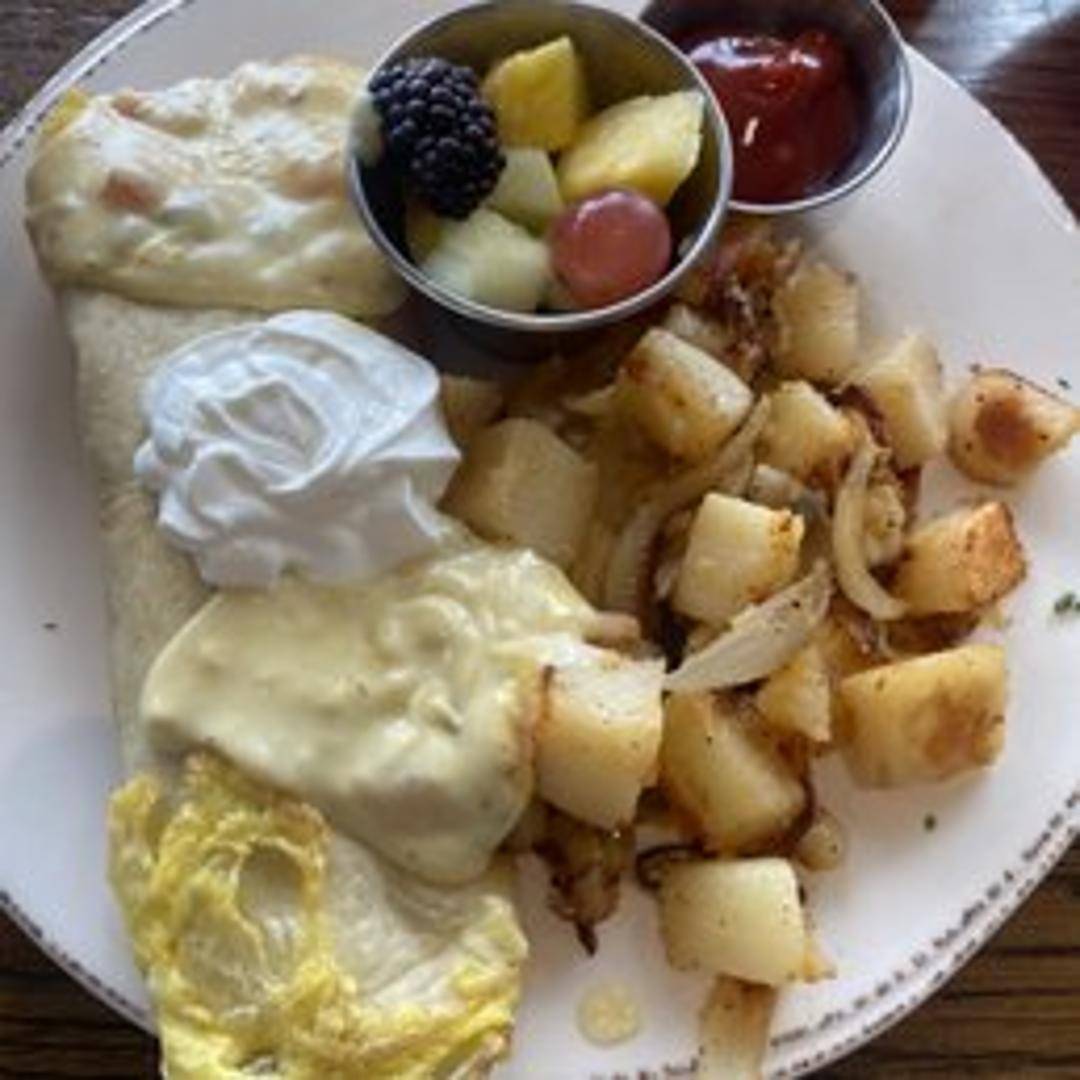 A flour tortilla filled with scrambled eggs, chicken, chorizo sausage, onions, and cheese, topped with a ranchero sauce and sour cream. Served with fresh fruit.