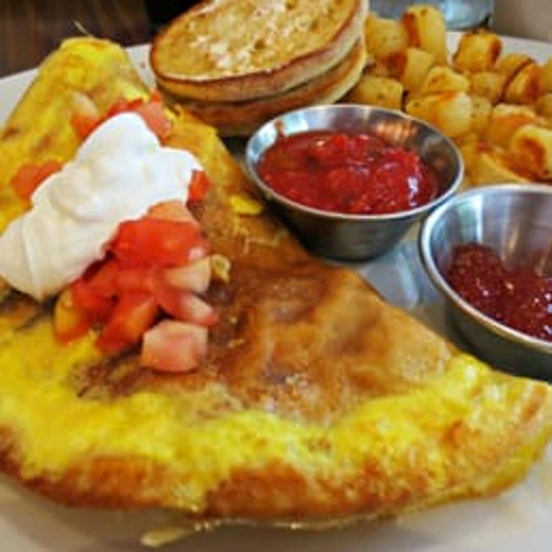 Indulge in our classic French toast, crafted from thick-cut, rich challah bread dipped in a vanilla-cinnamon batter and griddled to a golden, fluffy perfection. This vibrant dish is generously topped with a fresh medley of sliced strawberries, ripe bananas, and toasted coconut flakes, then finished with a delicate dusting of powdered sugar. Served with a side of warm maple syrup.