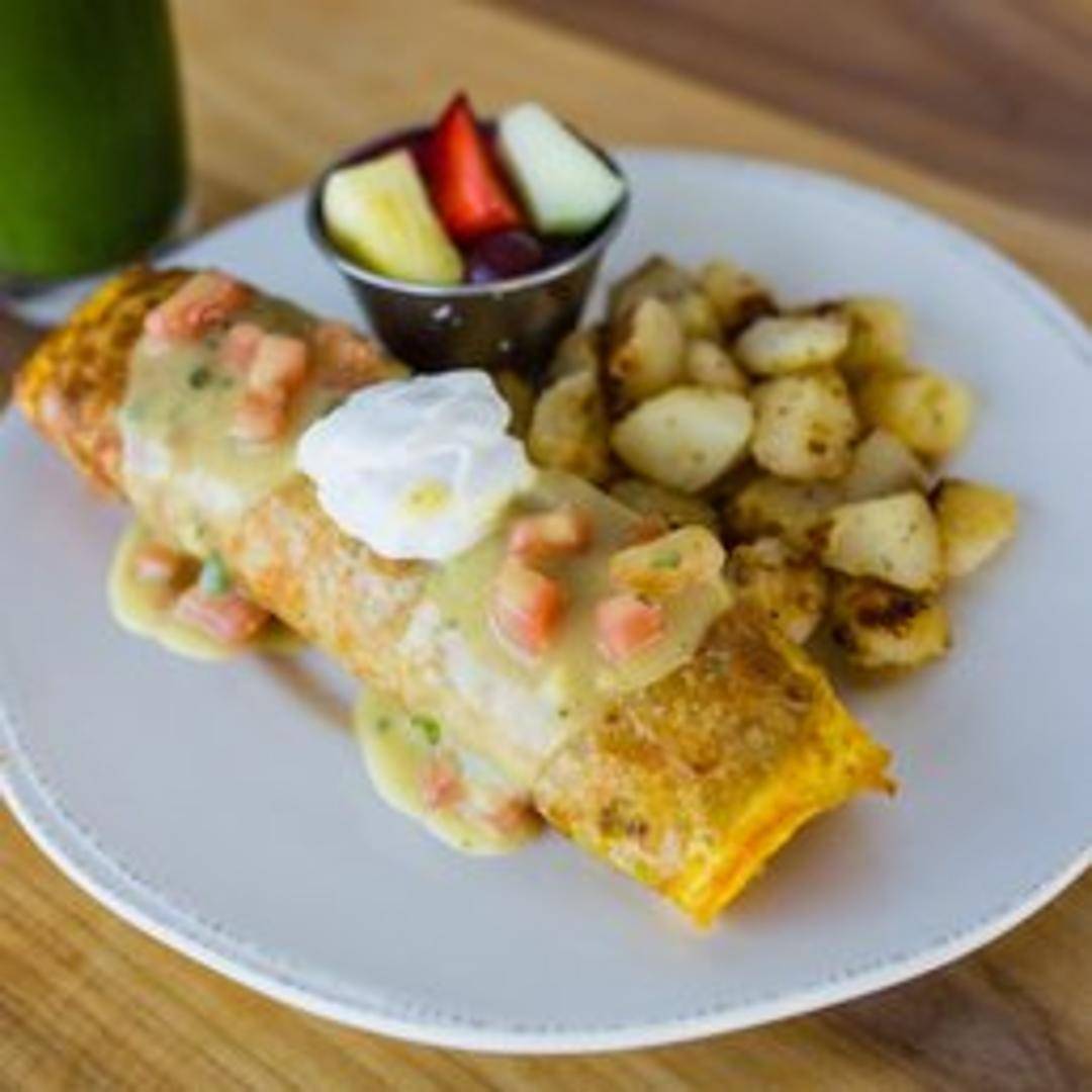 A breakfast-inspired take on a classic, featuring a savory blend of chicken, scrambled cage-free eggs, spicy chorizo, green chiles, cheddar and Monterey Jack cheeses, onions, and avocado, all wrapped in a flour tortilla, baked, and topped with zesty Vera Cruz sauce and sour cream.
