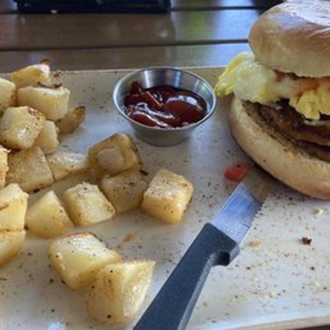 A classic breakfast ensemble designed to brighten your morning, typically featuring two cage-free eggs cooked to order, your choice of crispy bacon or savory sausage, alongside grilled seasoned potatoes and a warm slice of whole grain artisan toast.