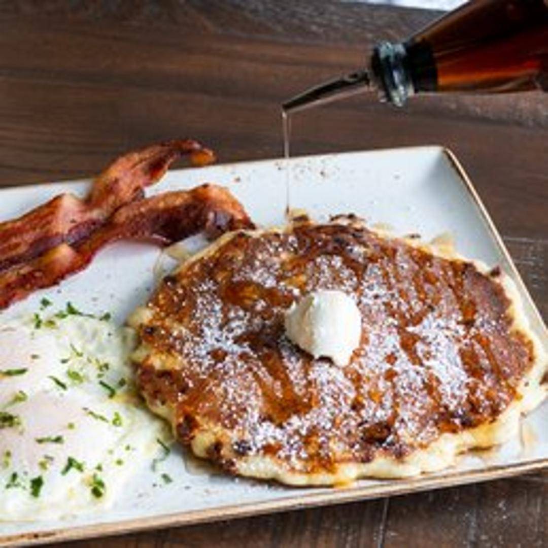 A comforting seasonal delight, featuring light and fluffy pumpkin pancakes spiced with cinnamon and nutmeg, served with two cage-free eggs cooked your way, and your choice of crispy bacon or savory sausage. A perfect taste of autumn.