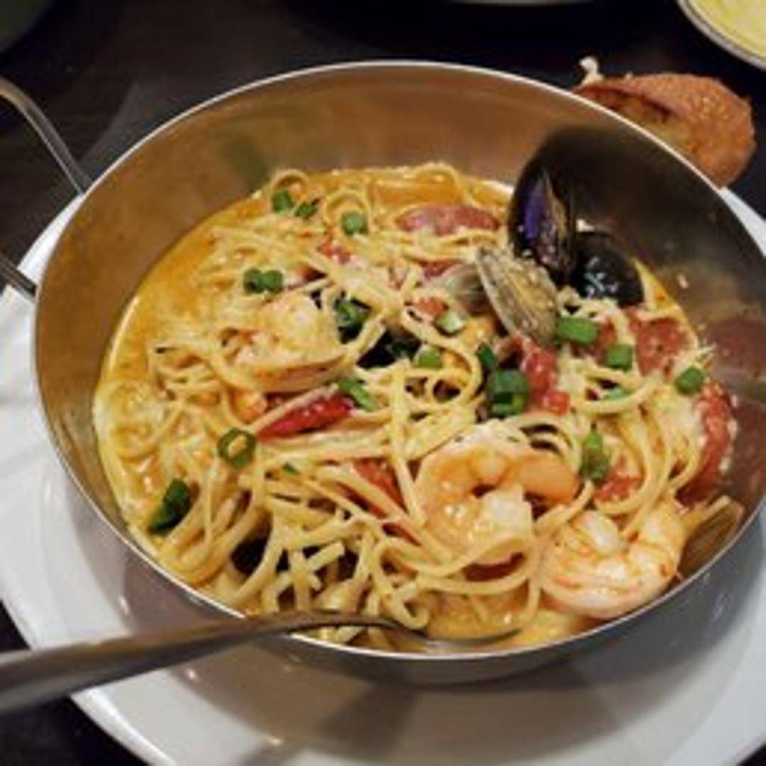 A generous portion of pasta tossed with crispy, seasoned fish bites. Served with your choice of sauce. Options may include marinara, Alfredo, or a creamy seafood sauce. Includes a side of garlic bread.