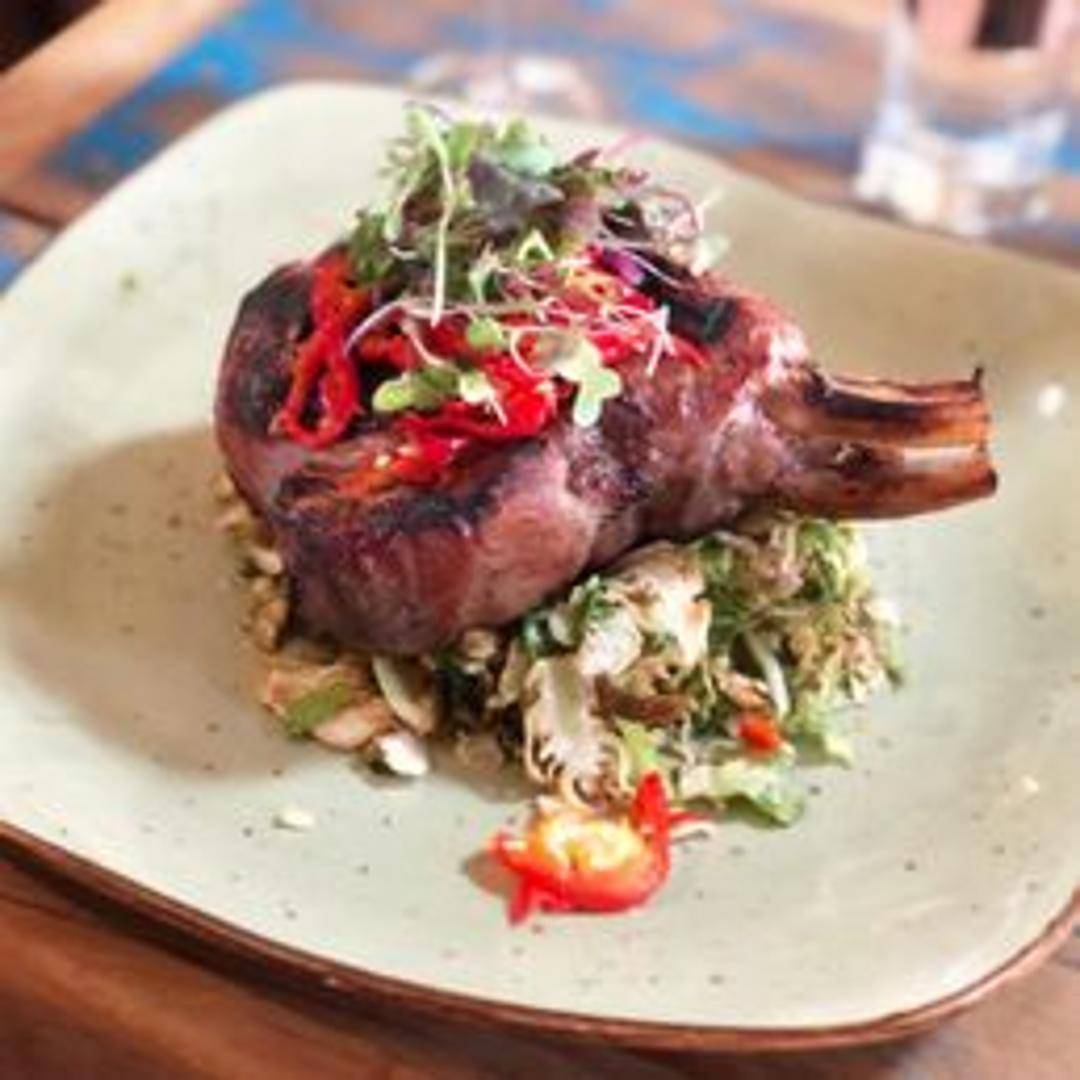 A grilled, bone-in pork chop, expertly seasoned and cooked to perfection. Served with accompanying sides that complement the rich, savory flavor of the pork. (Specific sides may vary, inquire with the restaurant.)