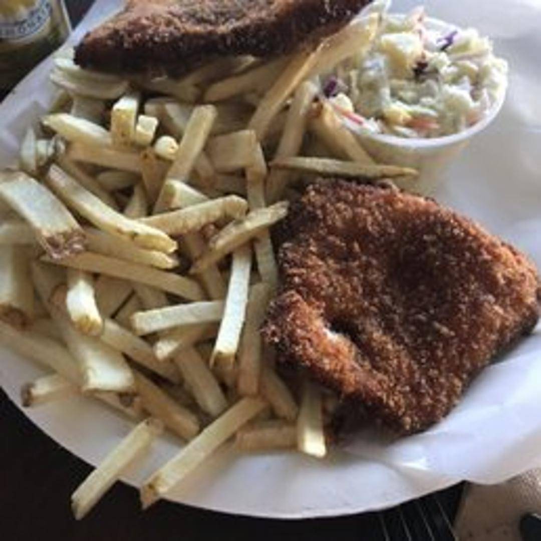 Crispy, golden-fried cod fillets served with a generous portion of seasoned fries and tartar sauce.