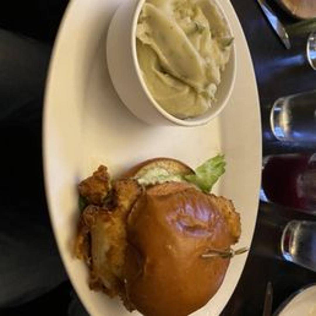 Crispy fried chicken breast served on a toasted bun with pickles, lettuce, and a spicy aioli.