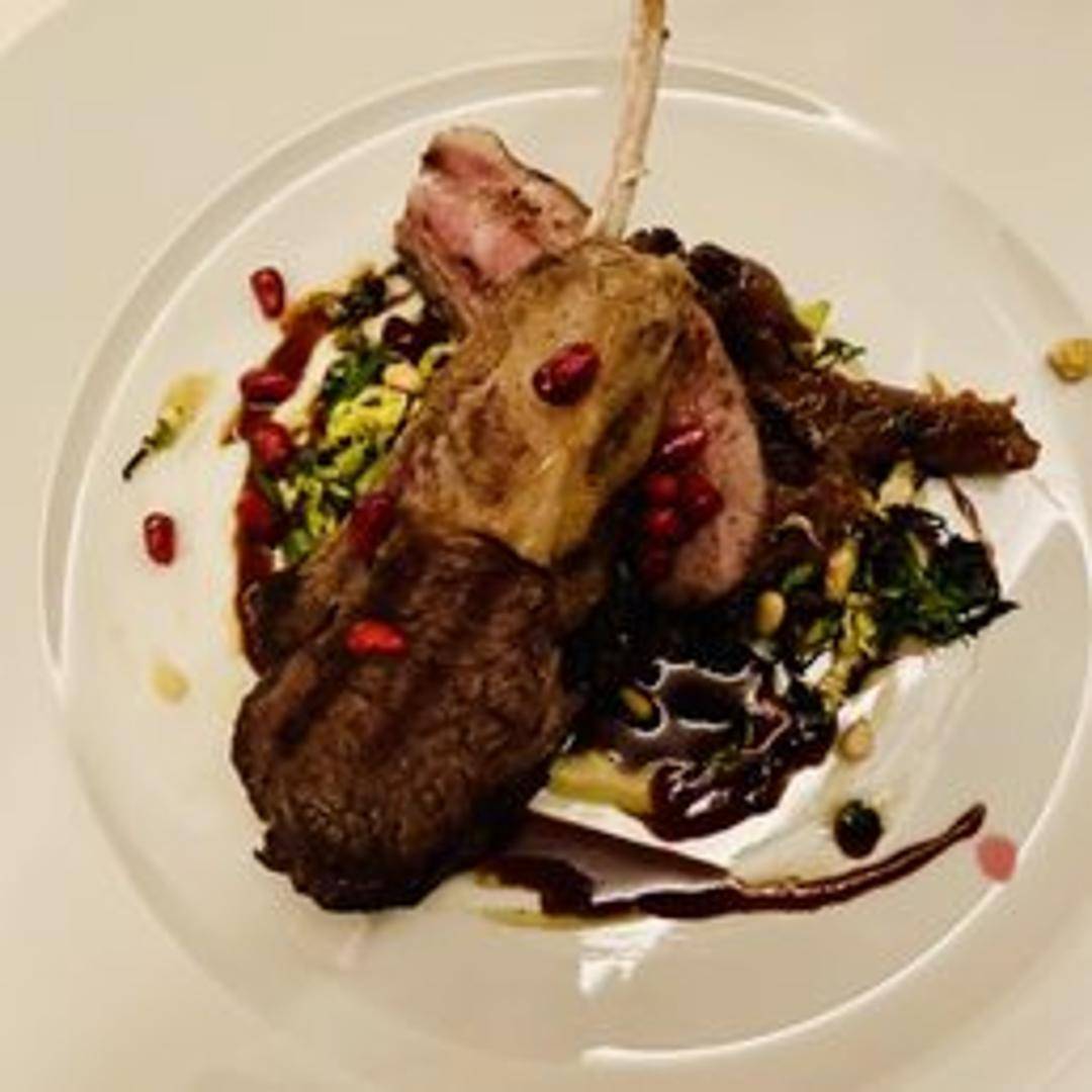 A roasted rack of lamb, known for its tender and flavorful meat. The bones are often frenched for an elegant presentation. Served with rosemary, garlic, and other herbs, and accompanied by complementary vegetables.