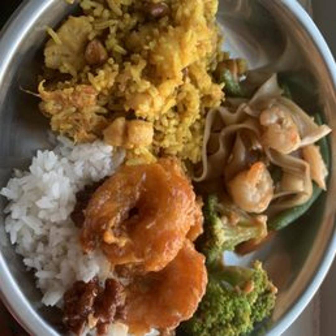 A vibrant and flavorful fried rice dish featuring fragrant jasmine rice stir-fried with juicy chunks of fresh pineapple, tender protein like chicken or shrimp, cashews, raisins, and a blend of aromatic spices. It offers a delightful balance of sweet, savory, and tangy notes, creating a unique and satisfying meal.
