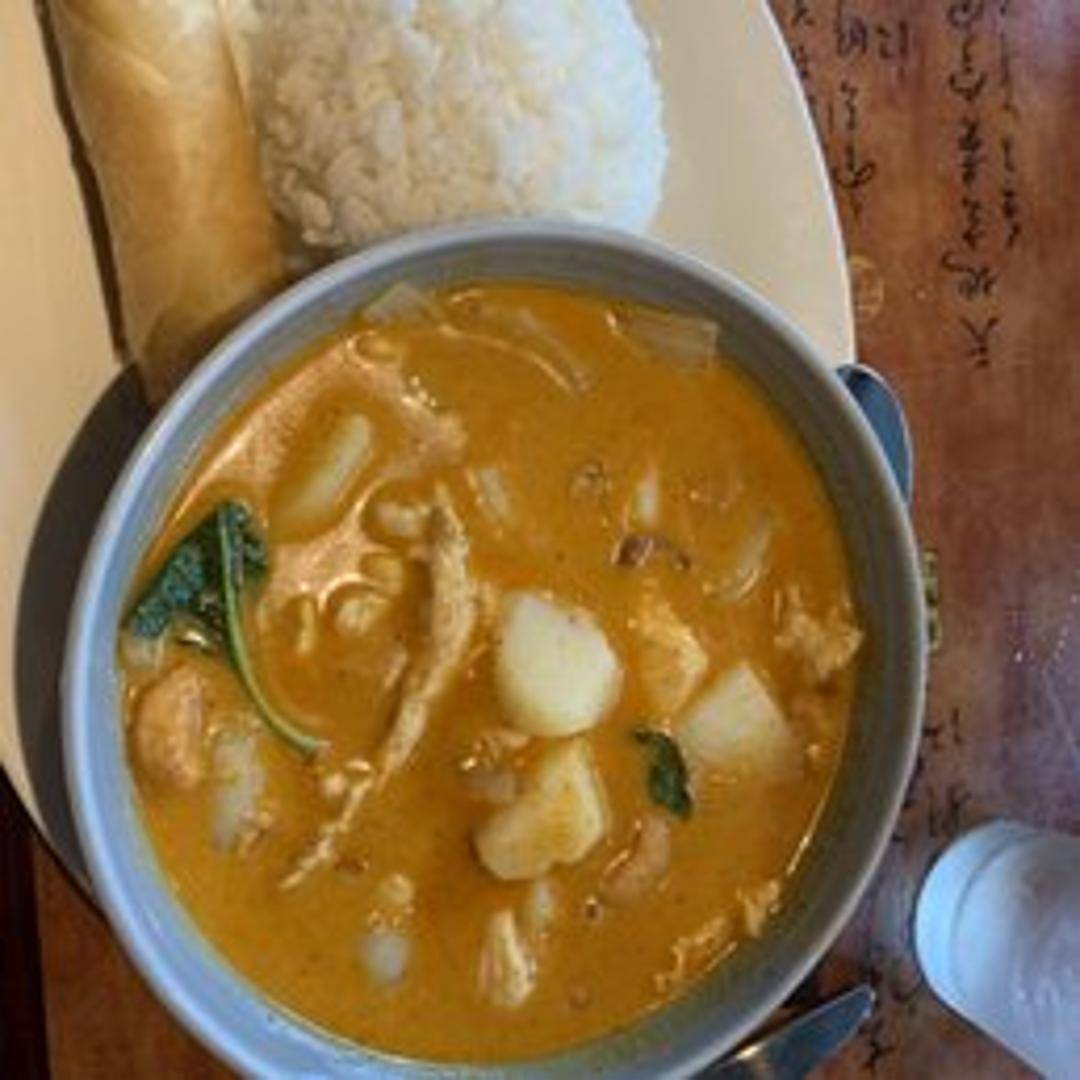 A rich and fragrant Thai curry characterized by its mild sweetness and deep aromatic spices including cardamom, cinnamon, and cloves. Made with creamy coconut milk, tender potatoes, and roasted peanuts, creating a hearty and flavorful dish.